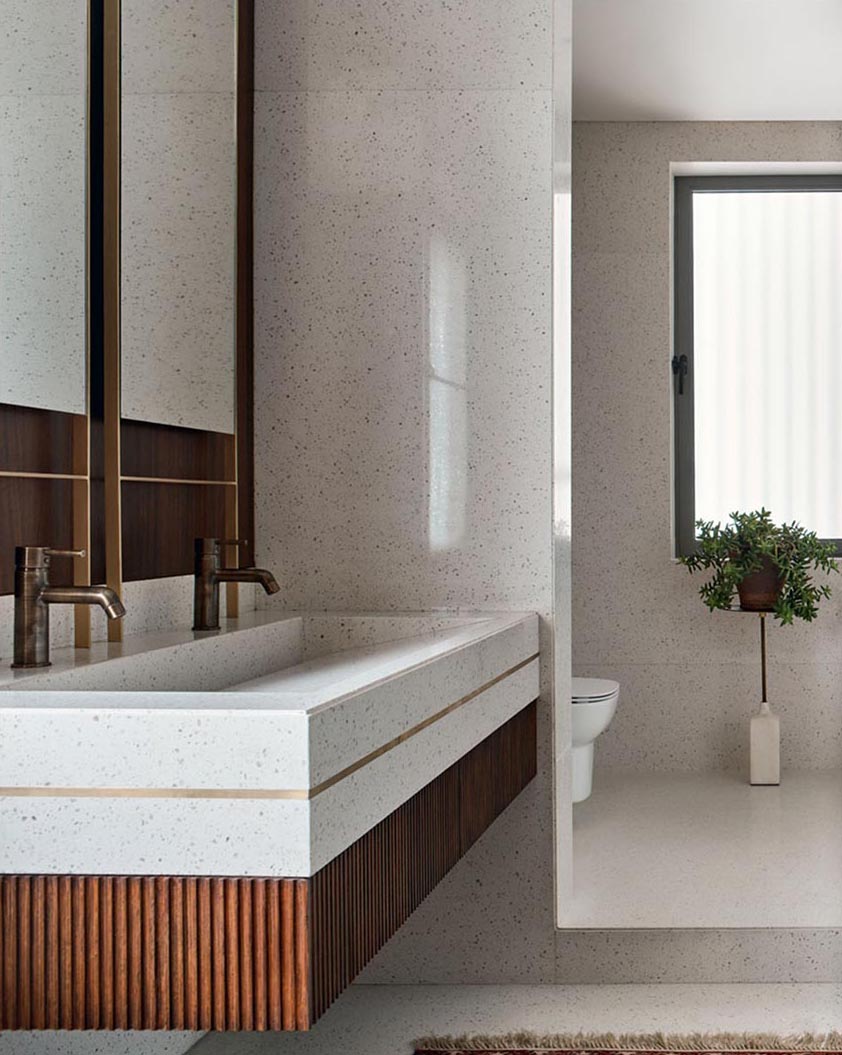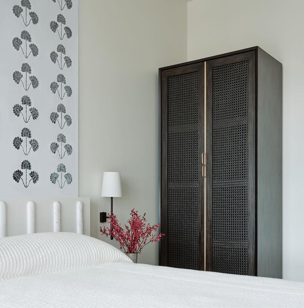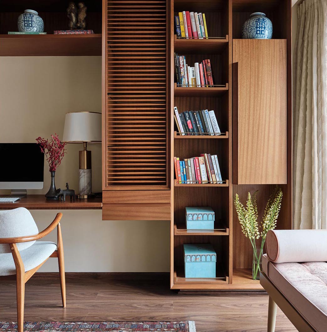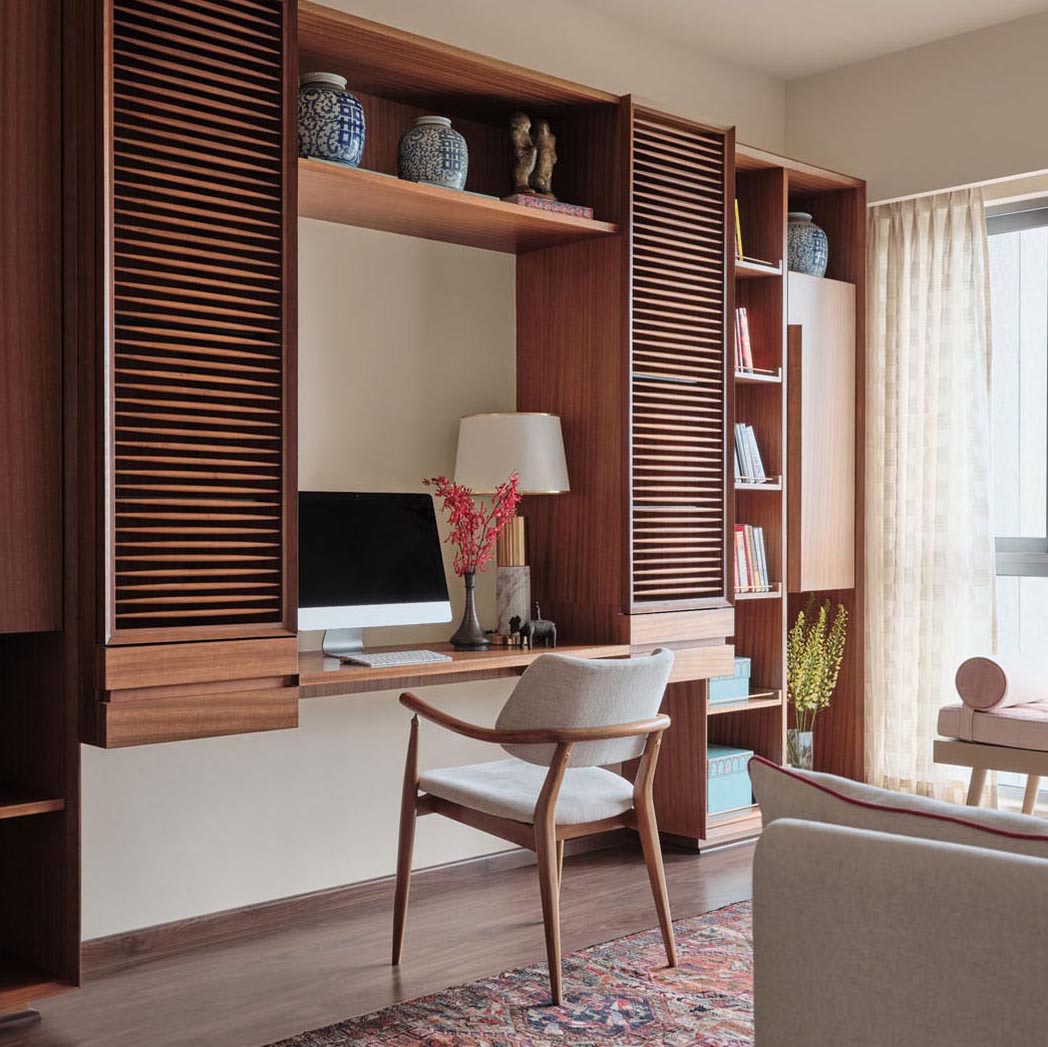 The study boasts a built-in unit that accommodates both work and leisure activities. The shutters feature hand-crafted wooden spindles arranged as louvers. The space grounds itself through an aged kilim rug whose weathered patterns speak of decades of usage and stories. The master suite prioritizes pale tones and subtle textures creating minimal clutter and a soothing atmosphere. The bathroom continues this philosophy while introducing detailed woodwork adding warmth to the pared down palette.