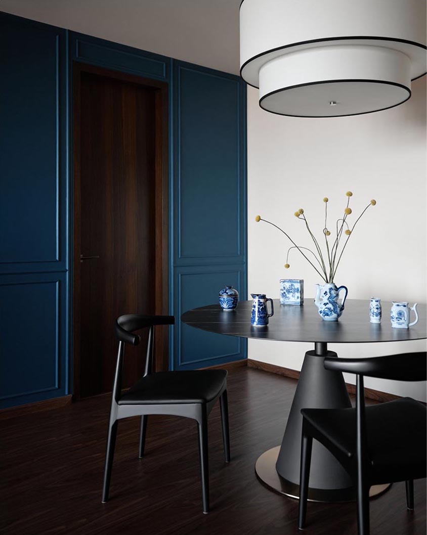 Emerging from the client's love for cerulean hues is the family room, also called the ‘Blue Room’. Deep indigo walls with antique blue and white Chinoiserie ceramics add layers of depth to the space.