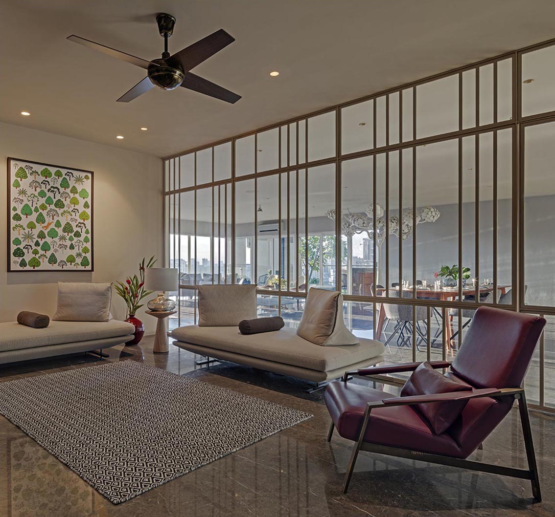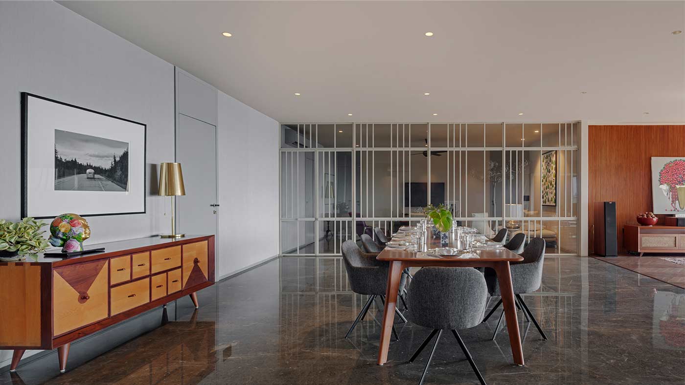 Spatial delineation occurs through subtle design gestures rather than heavy-handed divisions. A minimal metal screen, with integrated double doors, divides the larger living area and intimate family spaces. Glass panels within this partition ensure light's continuous flow while maintaining visual connection while offering a sense of separation.