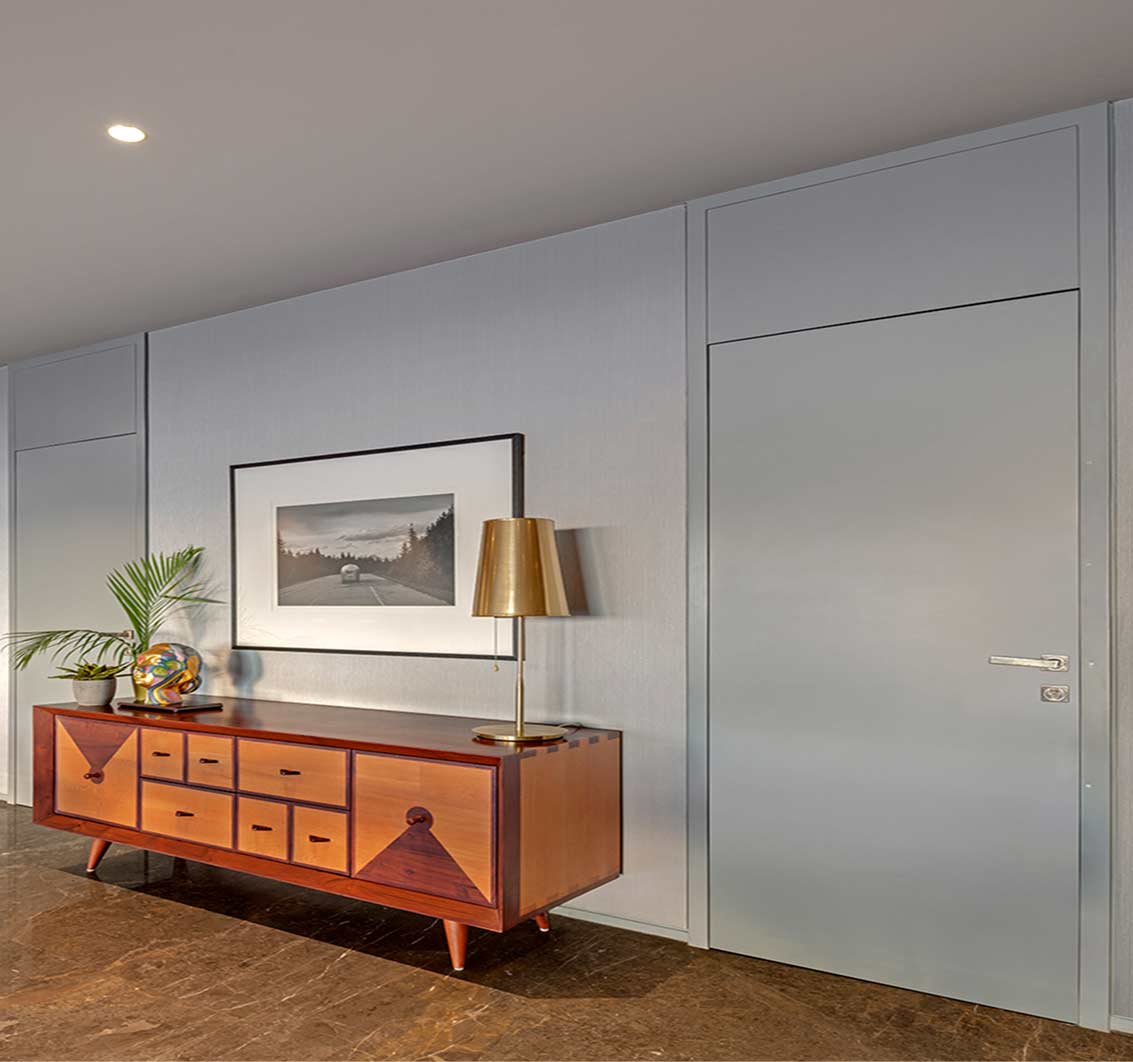The overall design language employs strategic deceptions to enhance spatial perception. Doors stretch from floor to ceiling, their surfaces matched seamlessly to grey wallpaper, making them vanish into the walls like hidden passages. This attention to continuity and concealment reinforces the overall sense of uninterrupted calm.